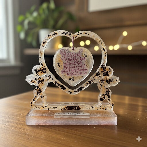 This lovely piece features a golden, speckled heart frame with two delicate angels on each side, holding a suspended scripture heart engraved with “Blessed is she who has believed that the Lord would fulfill His promises to her.” — Luke 1:45. The base carries a gentle reminder to “Love like Jesus,” making it a meaningful keepsake for any woman walking in faith.